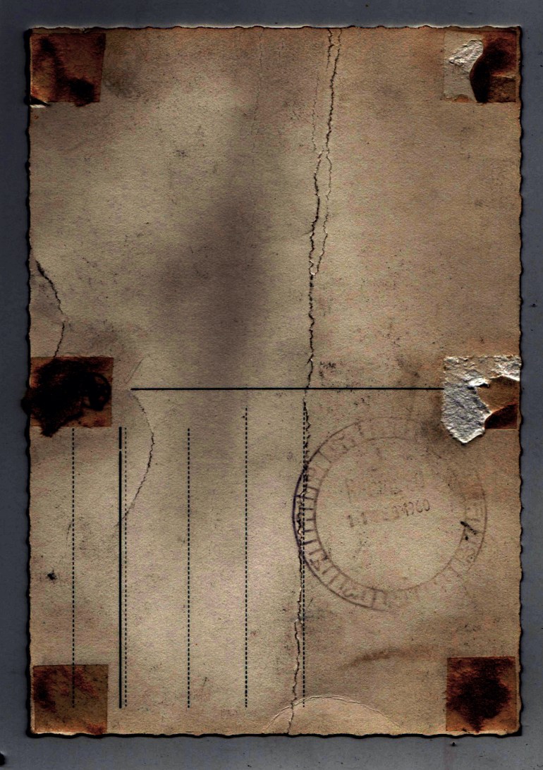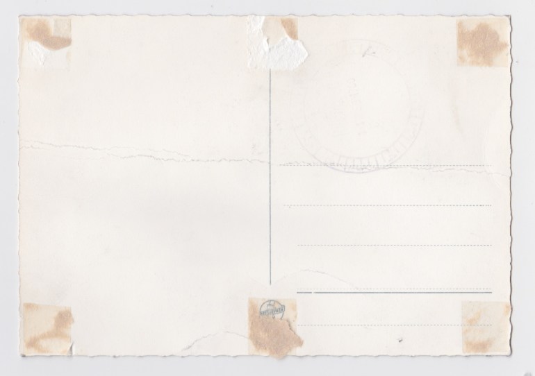 Postcard 3 is another blank one, but if you look really carefully, it has a received stamp, which dates it to February 1960 (I think). I’ve fiddled around with it a bit to make it more visible. It’s also been folded at some point.