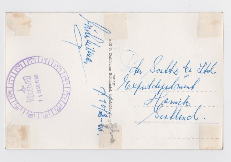 Here’s postcard 4, another from 1960. The handwritten date on there is the 29th of February, but it arrived in Hawick on the 14th of March.