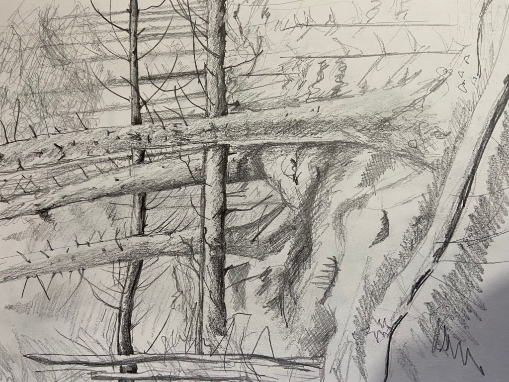 At the moment, I’m thinking about the angles the trees in this wood have fallen to, and what it might mean to try turn them back the right way up.