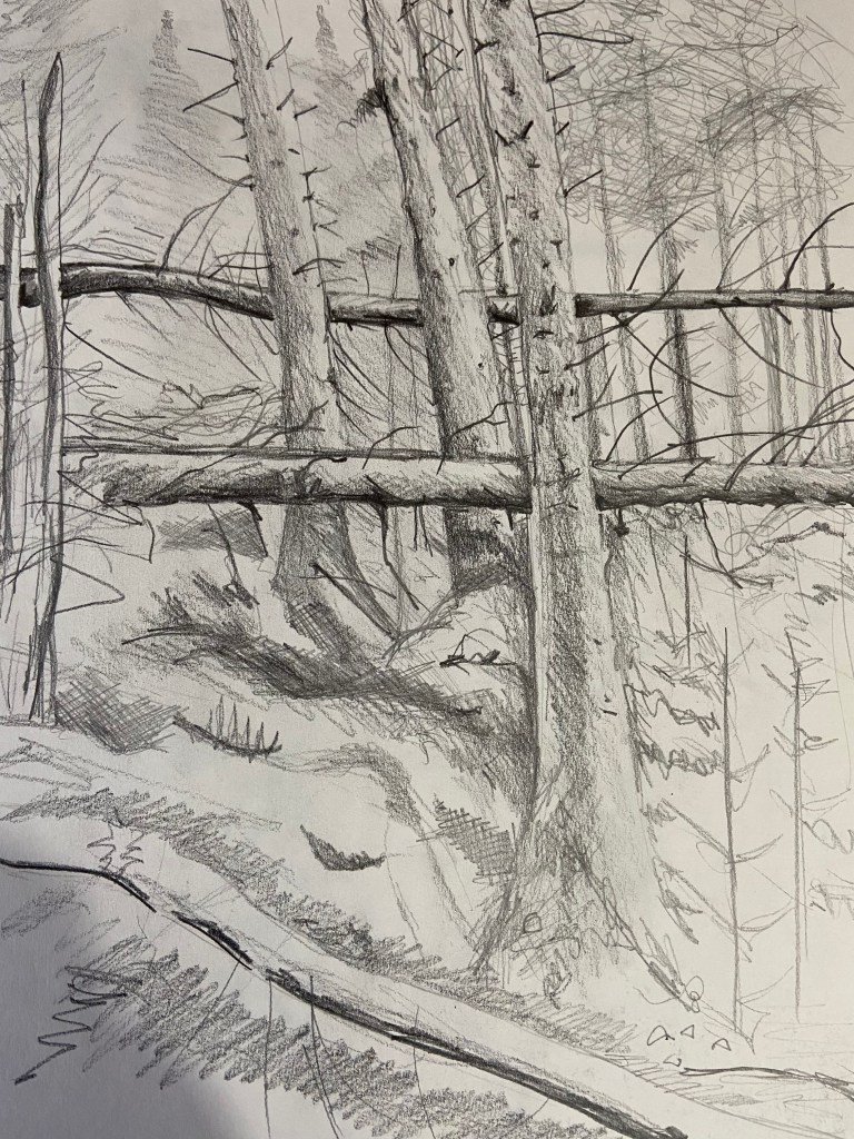 I’ve been drawing from the videos I shot in the woods. There’s a kind of nice challenge to drawing something that’s the wrong way around – like that exercise with the upside-down horse – it makes you stop and look at the shapes it’s making, rather than worrying that it doesn’t look like a horse.