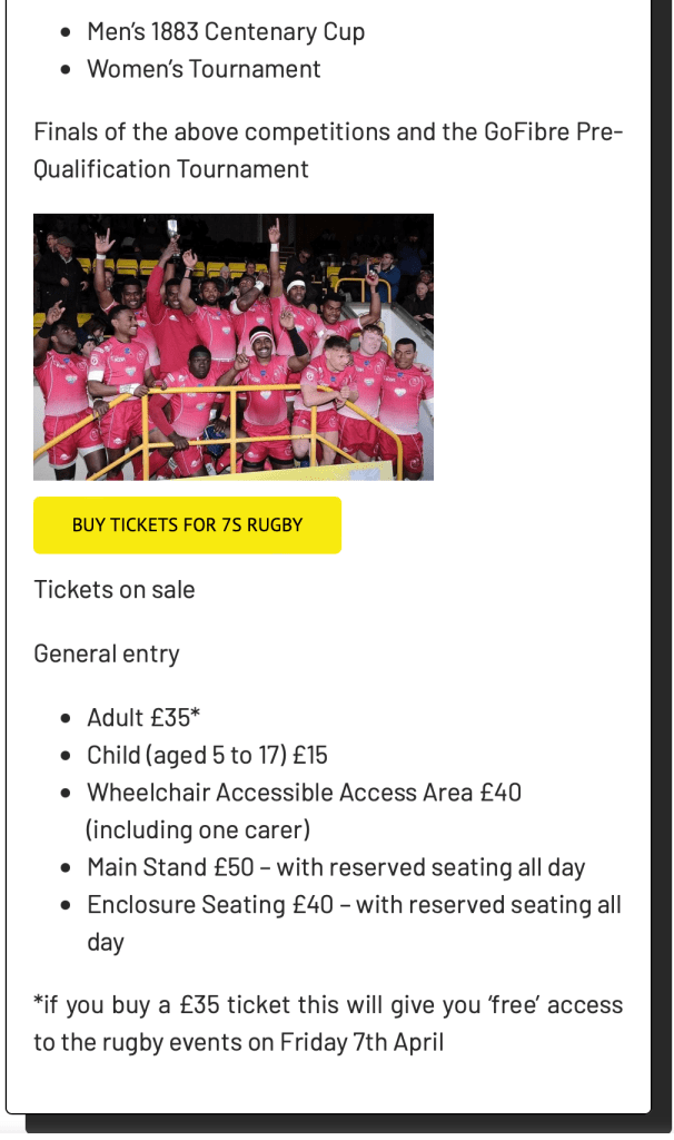 I had a bit of a nose around the website, unaware of wether there’s a equal split of women’s and men’s teams at the event and curious to find out, but have been completely railroaded by the ticket pricing for people who require wheelchair access. For the privilege of a spot that’s wheelchair friendly (and I assume friendly to folk with other mobility issues?), visitors get to pay £5 more than the rest of the crowd.