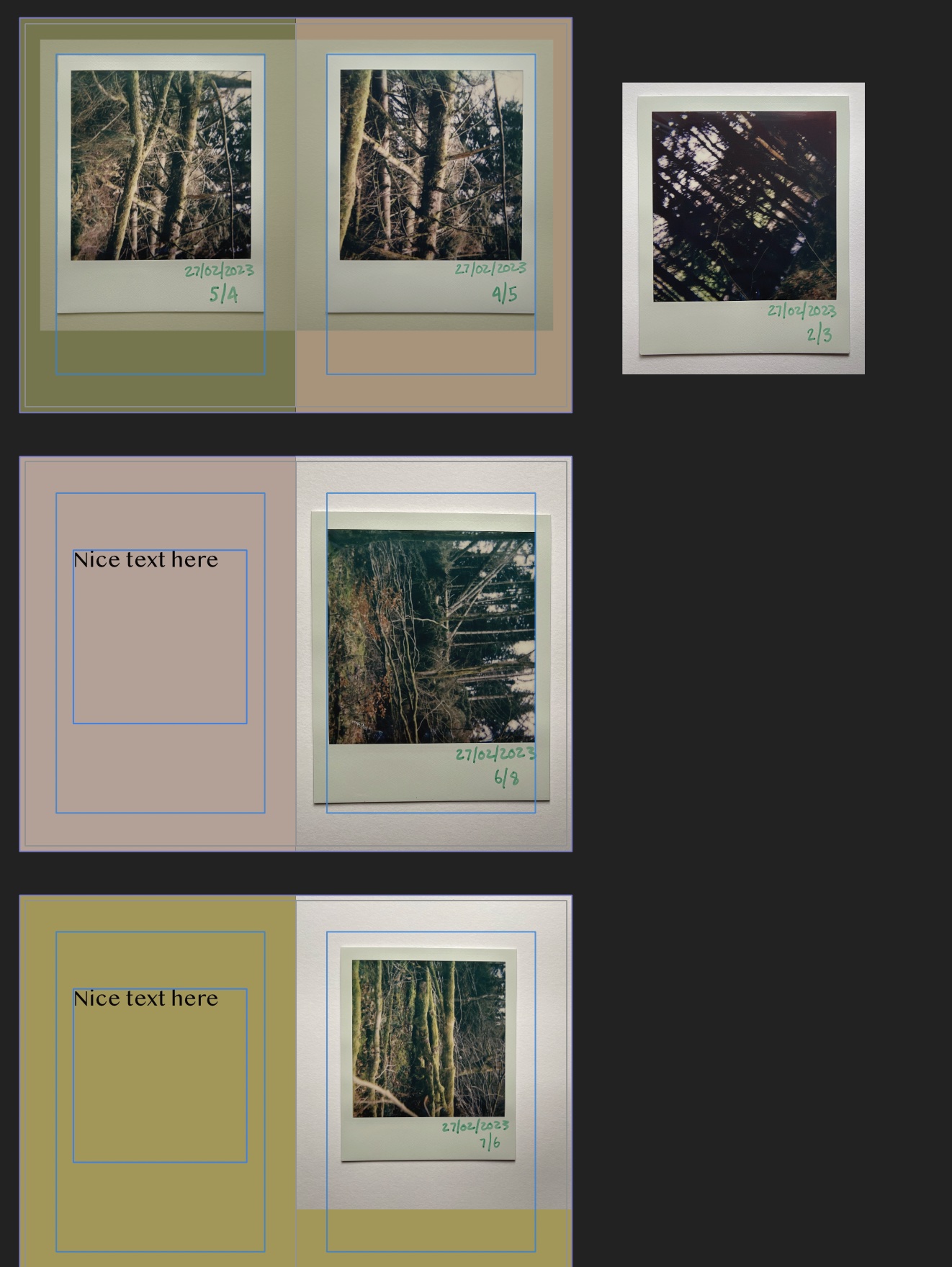 I think I’m going for an A5 size book, the same size as my very messy sketchbook. by going slightly smaller than I’ve worked on for I’ve Only Been Here Half My Life, I might be able to manage to make them hardback(!). It lets the images of polaroids be almost life-size, and will be a really lovely tactile size when it’s done. Alongside the planned Spring, Summer and Autumn books they’ll form a pleasing little set of publications. Right now, I’m getting focussed in on colour and shapes and straightening things up with affinity. I recently treated myself to the Affinity suite, which is like Photoshop, InDeisign, etc, but is actually affordable! It’s still a bit of a learning curve since I used Adobe for years (back when it was £200 for a student copy and there was no such thing as a subscription).