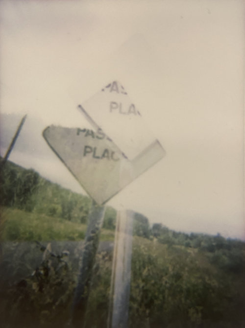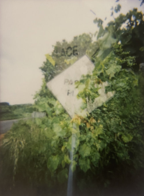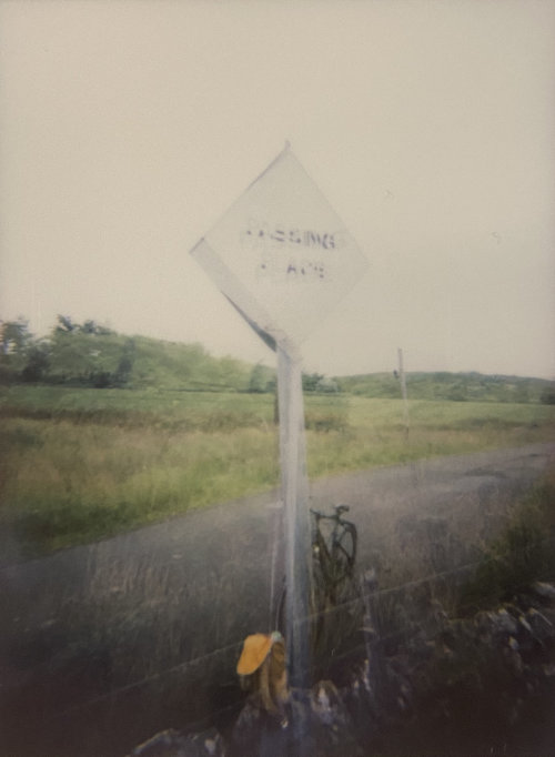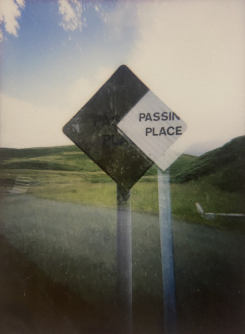 Yesterday evening, I rode my bike between home and town and took photos of all the passing places. I’ve done it before, but this time! I wanted to do it before the verges get cut, and I wanted to usse an instax camera. I spent a while last year carrying around two polaroids of one of my favourite passing places with me, like a kind of talisman, or like how people carry photos of their kids in their wallets. These were of the two sides of the passing place, and I’d glued them together, so like with a real passing place, only one side of the sign could be viewed at once.
