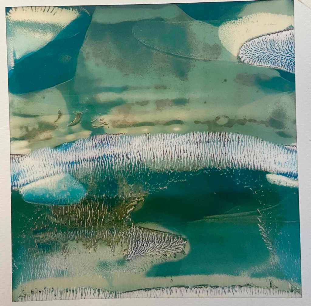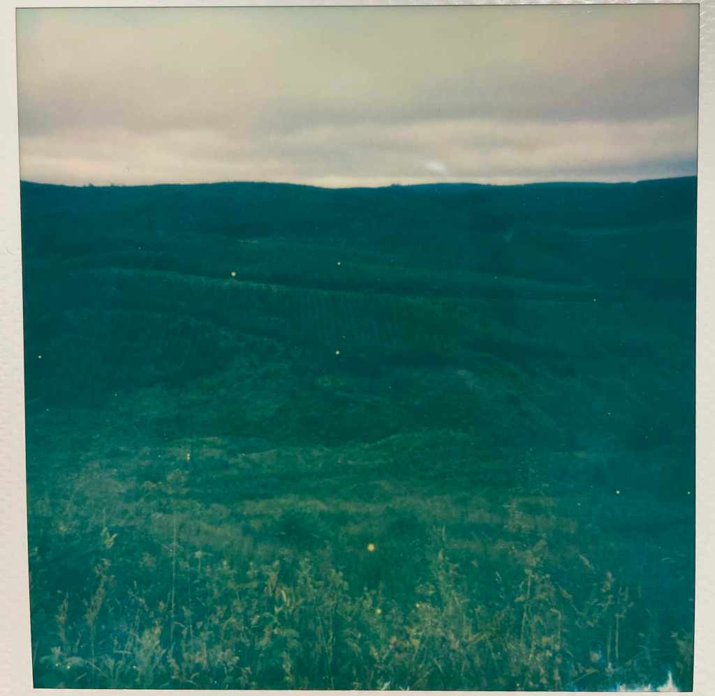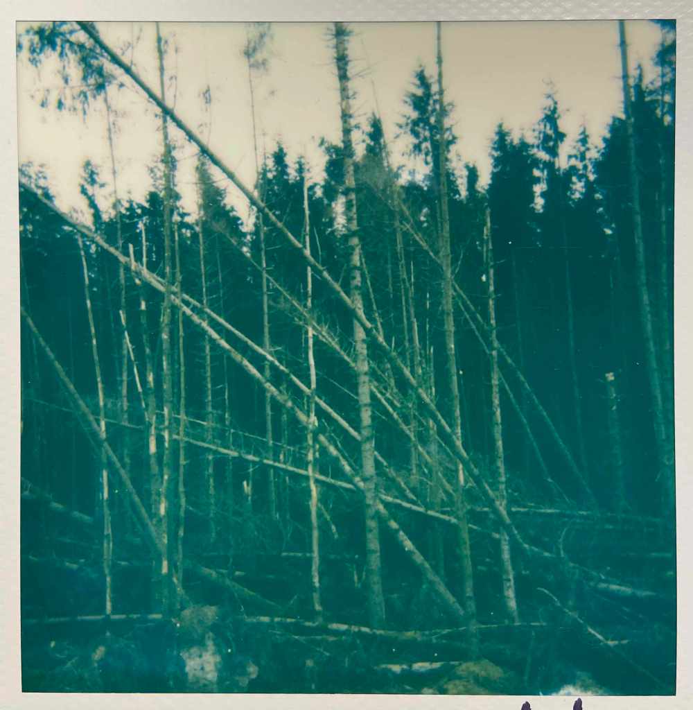 I’d actually taken along my not-quite-vintage polaroid camera – my second, which I bought only a month or so ago online, after I dropped the first one and it died. I’ve been trying to figure out how to make work about the commercial areas of the forest. The ‘natural’ ancient woodland parts are easier to fall into, I think, as there’s so much, so many different things to see and hear, the variety of trees and plants, fungi, birds and wildlife. The commercial parts, while only metres away in some places, are entirely different. They’re single-species blocks, planted in lines across the hills. They’re spiky, solid and hard, and mostly impenetrable. When you do get into the heart of them, they feel… sharp, vaguely threatening, and… boring. Lines upon lines of the same tall straight trunks. Some parts are mossy and green and look amazing, when the light shines the right way and the pollen bobs around in the breeze, they’re spectacular. Some parts are like the dead areas of bleached coral – blank and empty and sad.