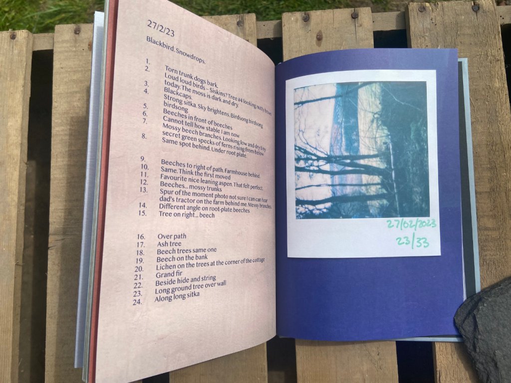 The book is a collection of polaroid photographs and words from my notebooks as I photographed the woods during the winter of 2022-23, between December and March. It’s 52 pages long and bound in hardback.