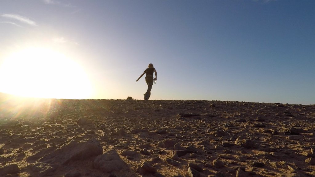 A woman walks in a foreign desert, attempting to make sense of a trauma.